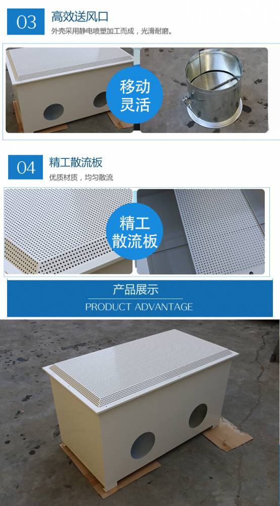 高效送風(fēng)口為千級(jí)、萬(wàn)級(jí)、十萬(wàn)級(jí)凈化空調(diào)系統(tǒng)較為理想的終端過(guò)濾裝置,可廣泛于醫(yī)藥、衛(wèi)生、電子、化工等行業(yè)的凈化空調(diào)系統(tǒng)。高效送風(fēng)口是用作改造和新建1000-300000級(jí)各級(jí)潔凈室的終端過(guò)濾裝置,是滿足凈化要求的關(guān)鍵設(shè)備。高效送風(fēng)口包含靜壓箱,散流板,高效過(guò)濾器,與風(fēng)管的接口可為頂接或側(cè)接。