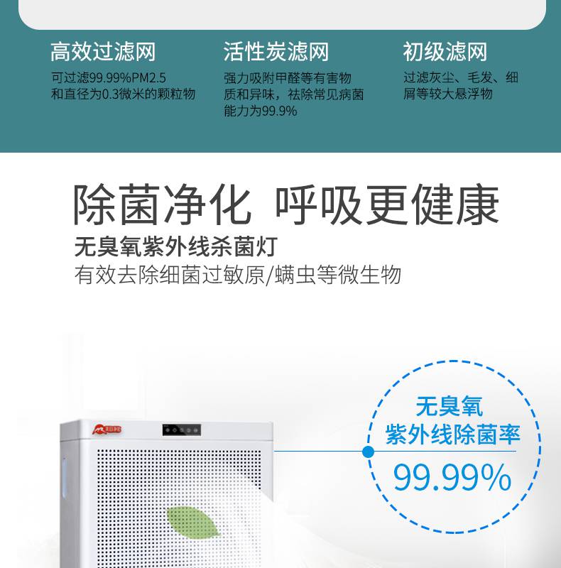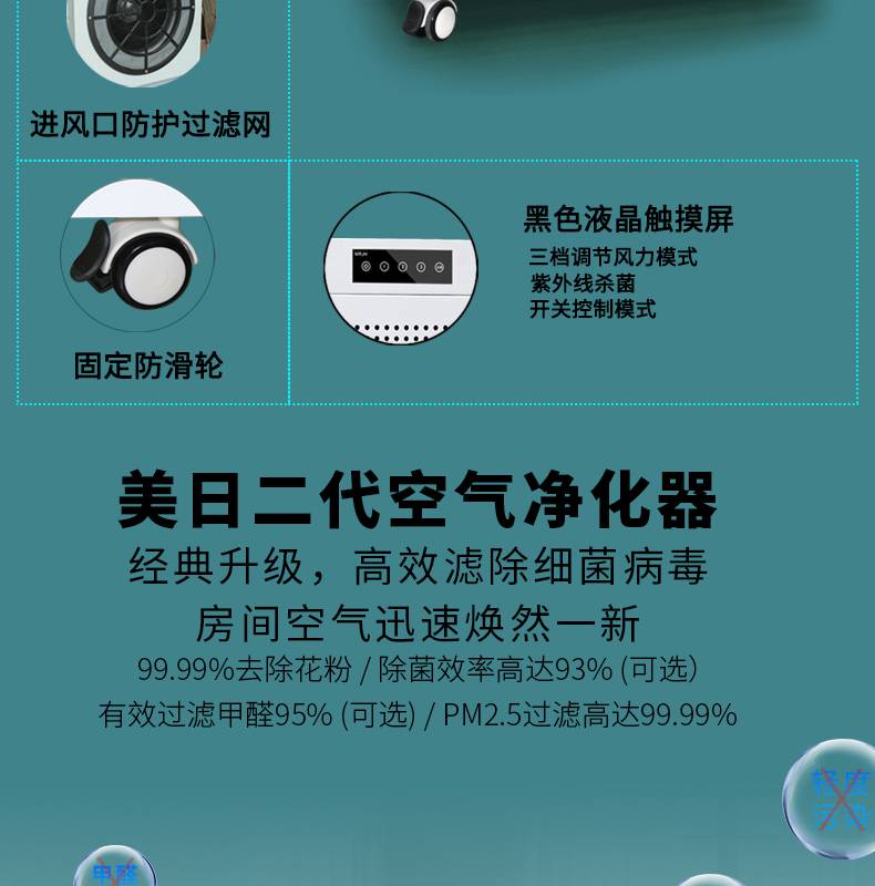 每日凈化空氣凈化器,紫外線快速殺菌、快速除甲醛、PM2.5、過濾煙塵、殺滅細菌和病毒、清除異味、降解有毒化學氣體、凈化清新空氣、呵護人體健康等;多檔風速、多向氣流、及低噪音等。